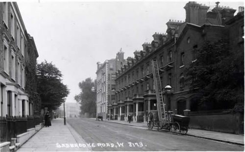 Beyond Bonham House, Nos. 109-119 odds constitute three pairs of semi-detached villas, built in the 1840s by the builder/architect William John Drew on sites rented to him by James Weller Ladbroke. There was a fourth pair, probably built by Drew at the same time, but it was demolished to make way for Lansdowne House. The remaining villas have all been altered over the years, but still show signs of their former elegance. According to the Survey of London, it is thought that Allason, James Weller Ladbroke’s own surveyor, may have had a hand in their design. They are the earliest houses in the street, and some of the earliest on the Ladbroke estate. The houses are brick and are characterised by distinctive stucco strips surmounted by pseudo-capitals decorated with rosettes; and bowed projections on their sides. Originally, they had only two floors above ground level, but all have gained extra floors, as well as various other additions, including in several cases deep back extensions.The freeholds of Nos. 103-111 were acquired by W.J. Drew, probably from Felix Ladbroke in the 1850s and remained in the Drew family until the early 20th century. No. 109 was sold by the Drew family trust only in 1919 (see deed No, 47889 in Kensington Public Library.