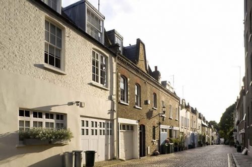 During the conversions, a variety of differently shaped windows, doors and balconies were inserted, and often brickwork was plastered over and painted. In some cases, the old building was demolished altogether, and an entirely new dwelling erected and many of today’s buildings give little idea of what they originally looked like. The mews has retained its cobbles.